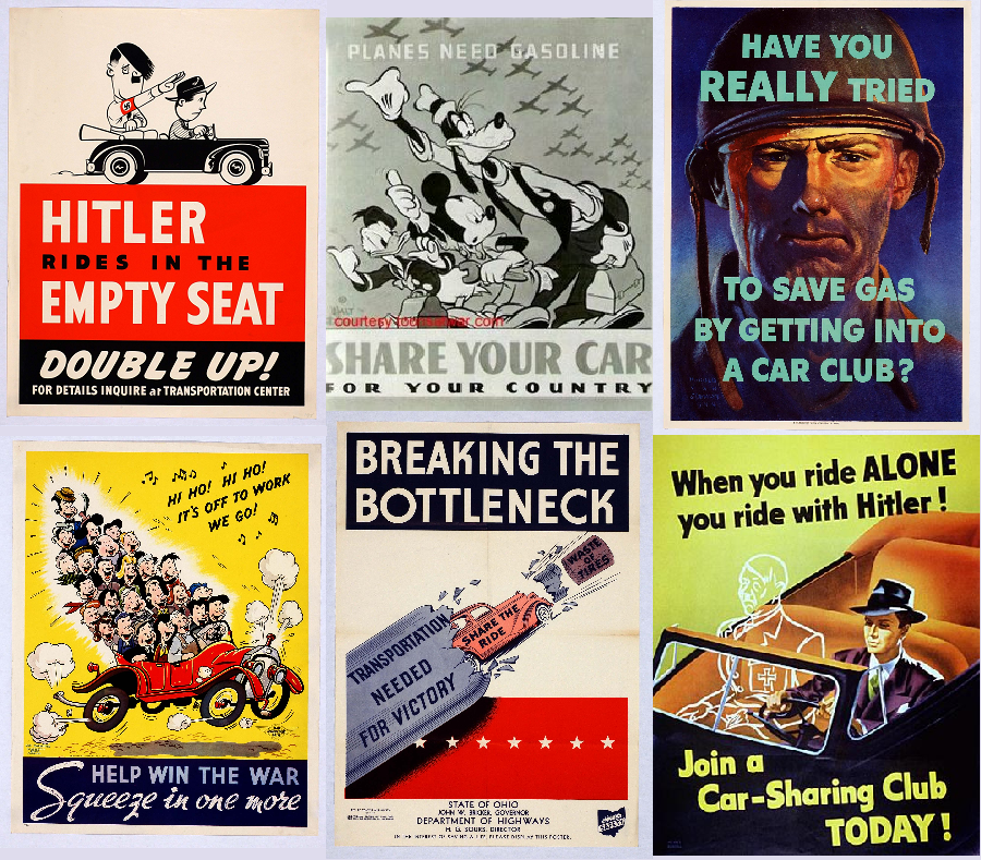 Carteles de propaganda durante la II Guerra Mundial, fomentando compartir coche para ahorrar combustible.